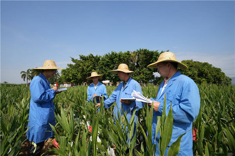 科研人员海南调查雄穗分支数。国投丰乐供图
